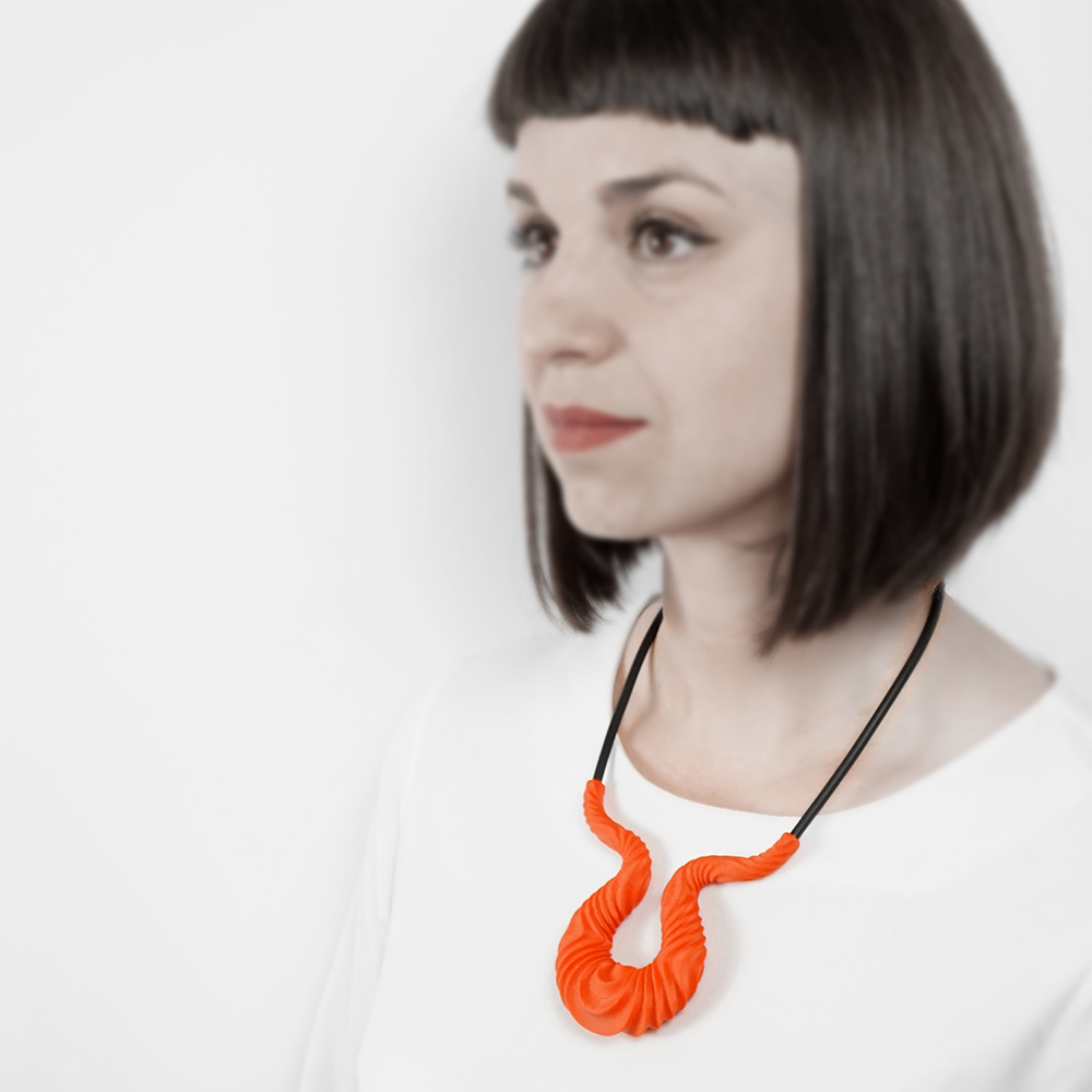 The C_M neckpiece is designed in the computational environment by algorithmic generation and is materialized by 3d printing ABS plastic.